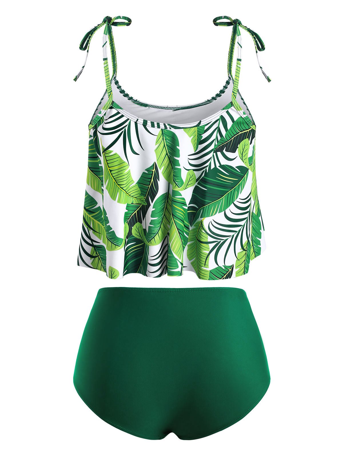 Freshen up your beach look with this mix-and-match tankini set. The leaves print tankini top is finished with the tie-shoulder design to the silhouette elevated. The high-waisted solid-color bottom is finished with the ruched detailing to offers enough coverage and comfort.