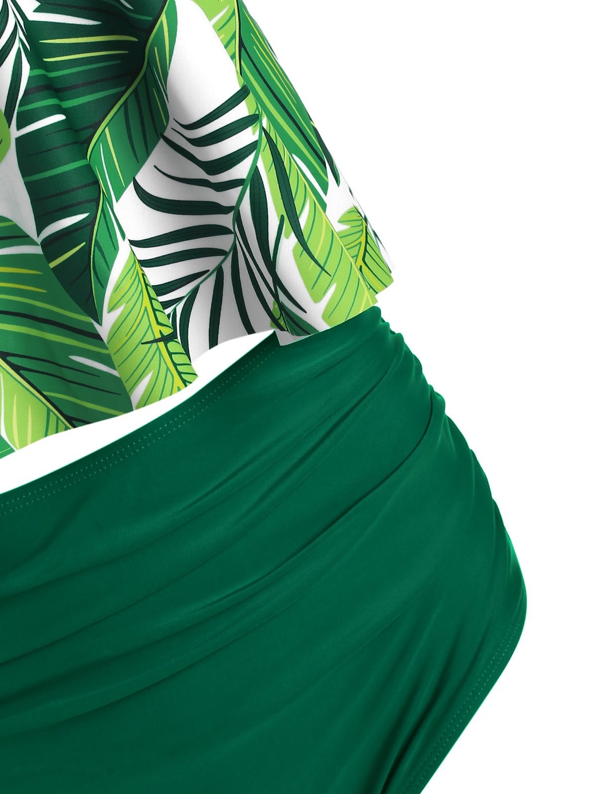 High Waisted Tie Shoulder Ruched Leaves Print Tankini Swimsuit