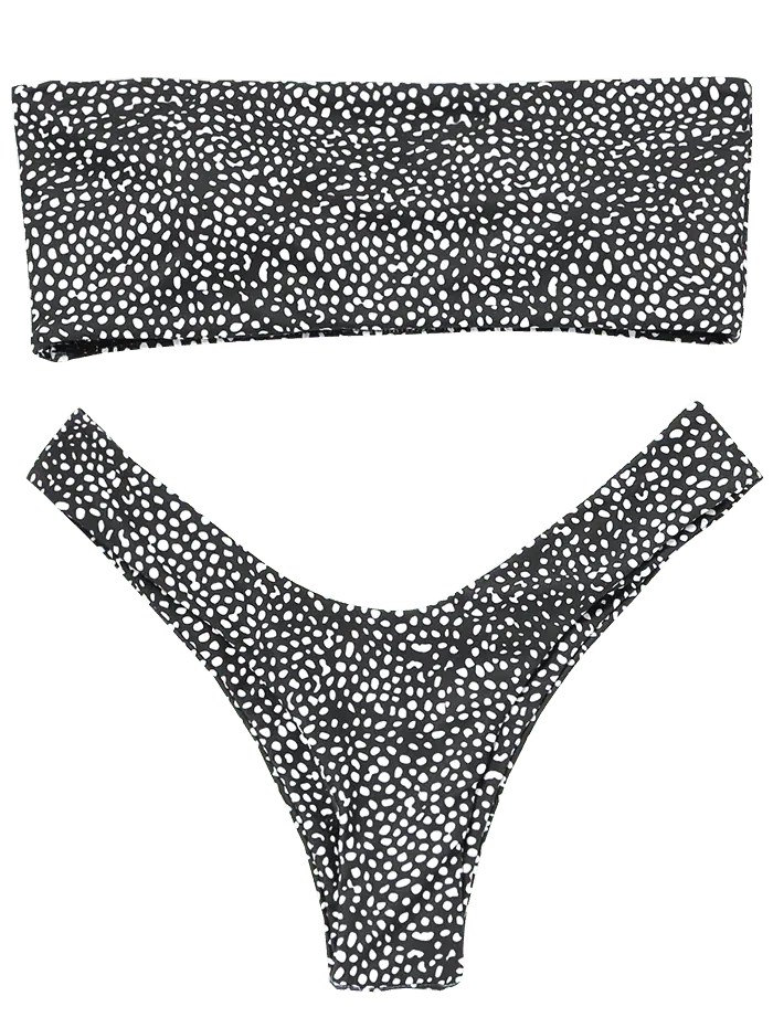 Classic and sexy bikini set in a leopard print. The bikini bra features a strapless bandeau collar with padded cups. Thong swim bottoms in a high cut leg design.