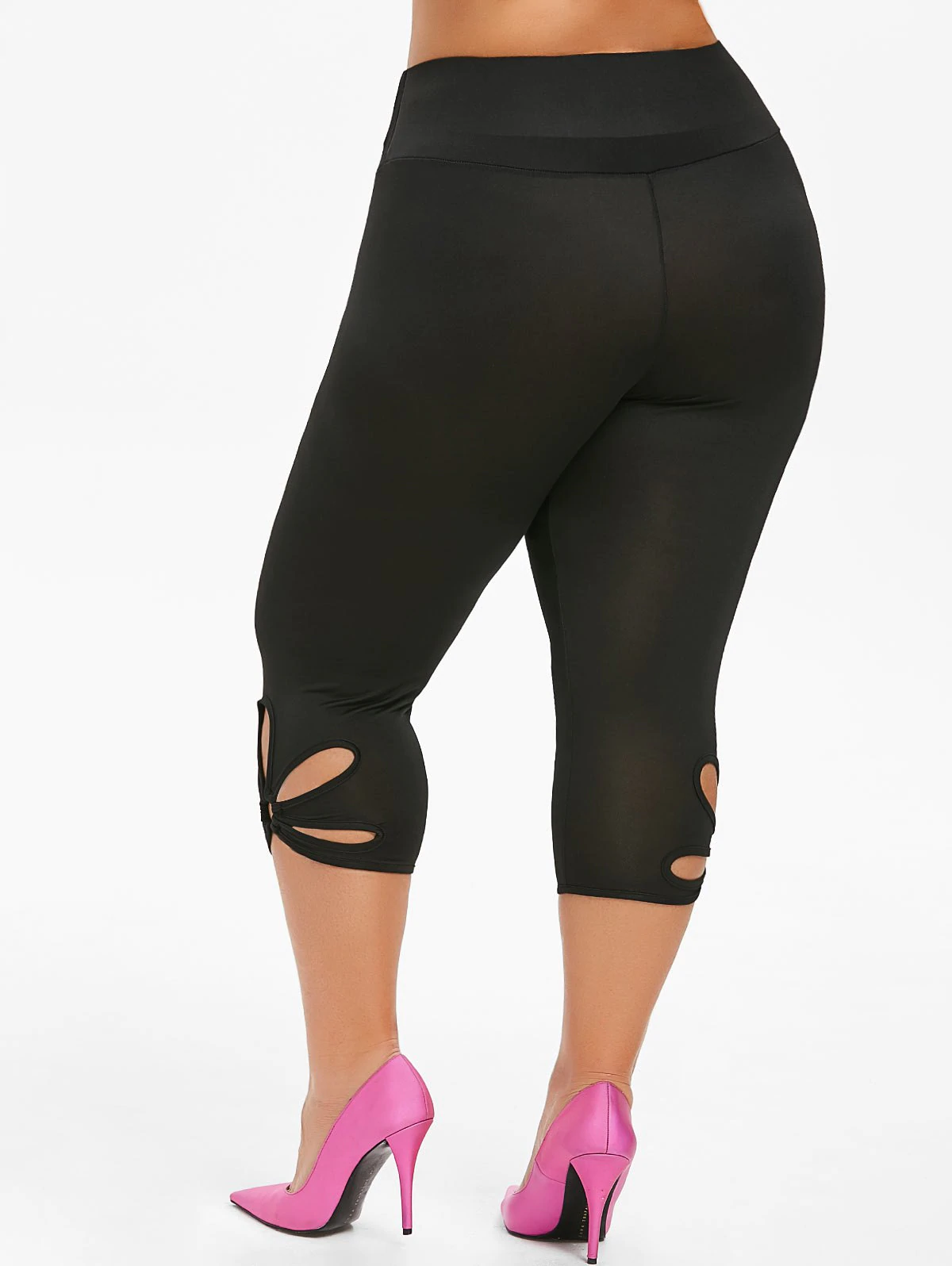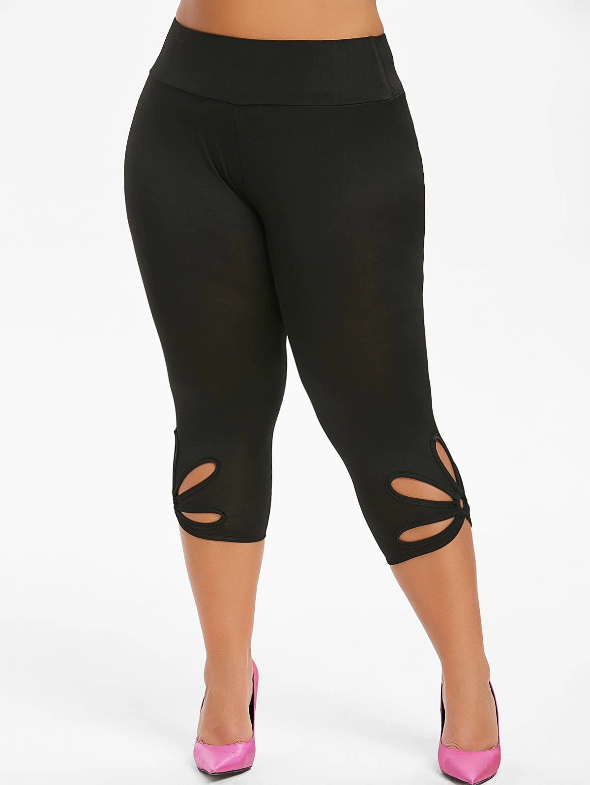 Accentuated by the flattering floral hem cutouts connected with the metallic o-ring construction to flatter the silhouette, these plus-size leggings have a sleek high-rise cut and the just-right capri length making it a perfect companion for your cropped tops or tucked-in tops.