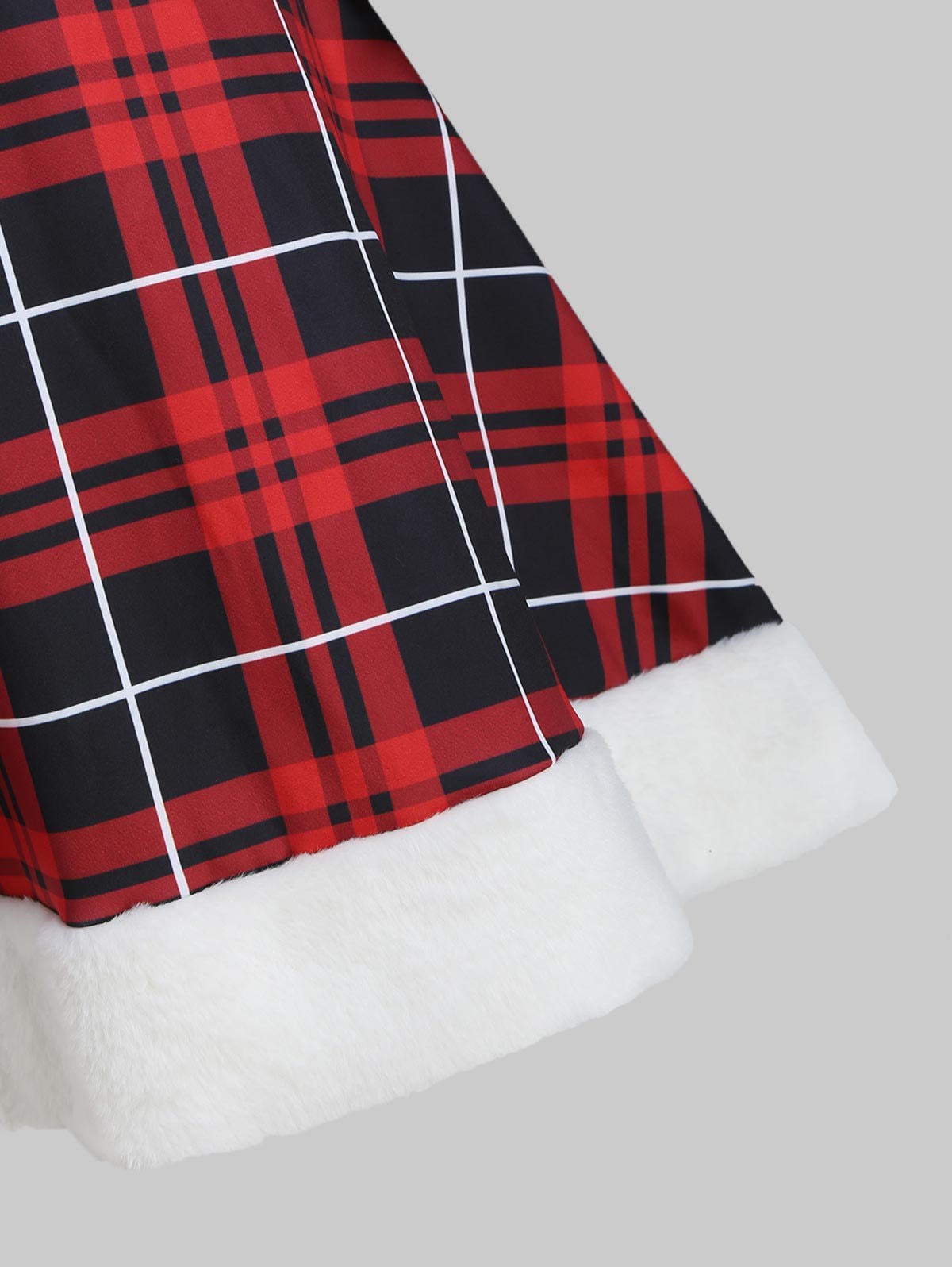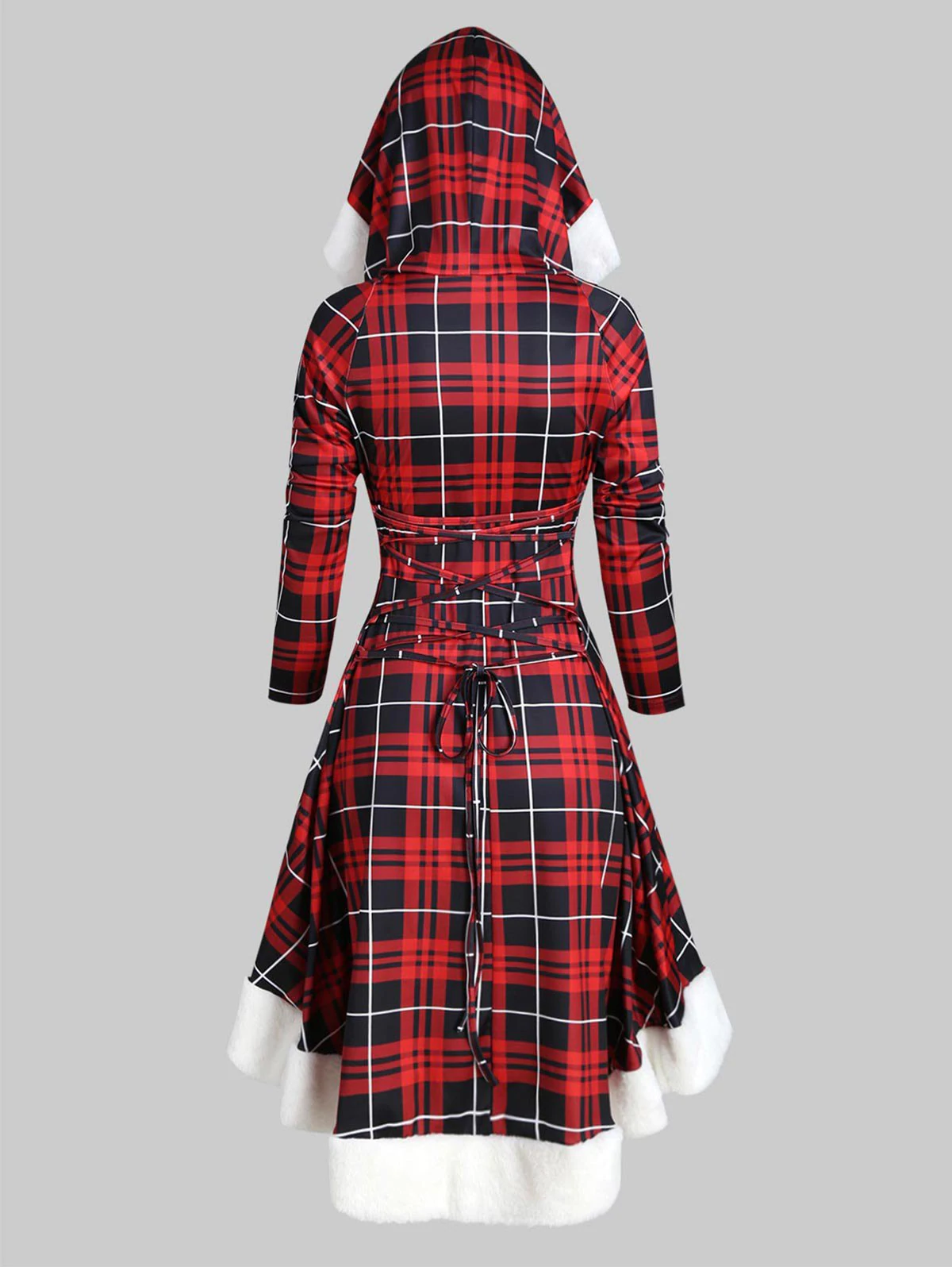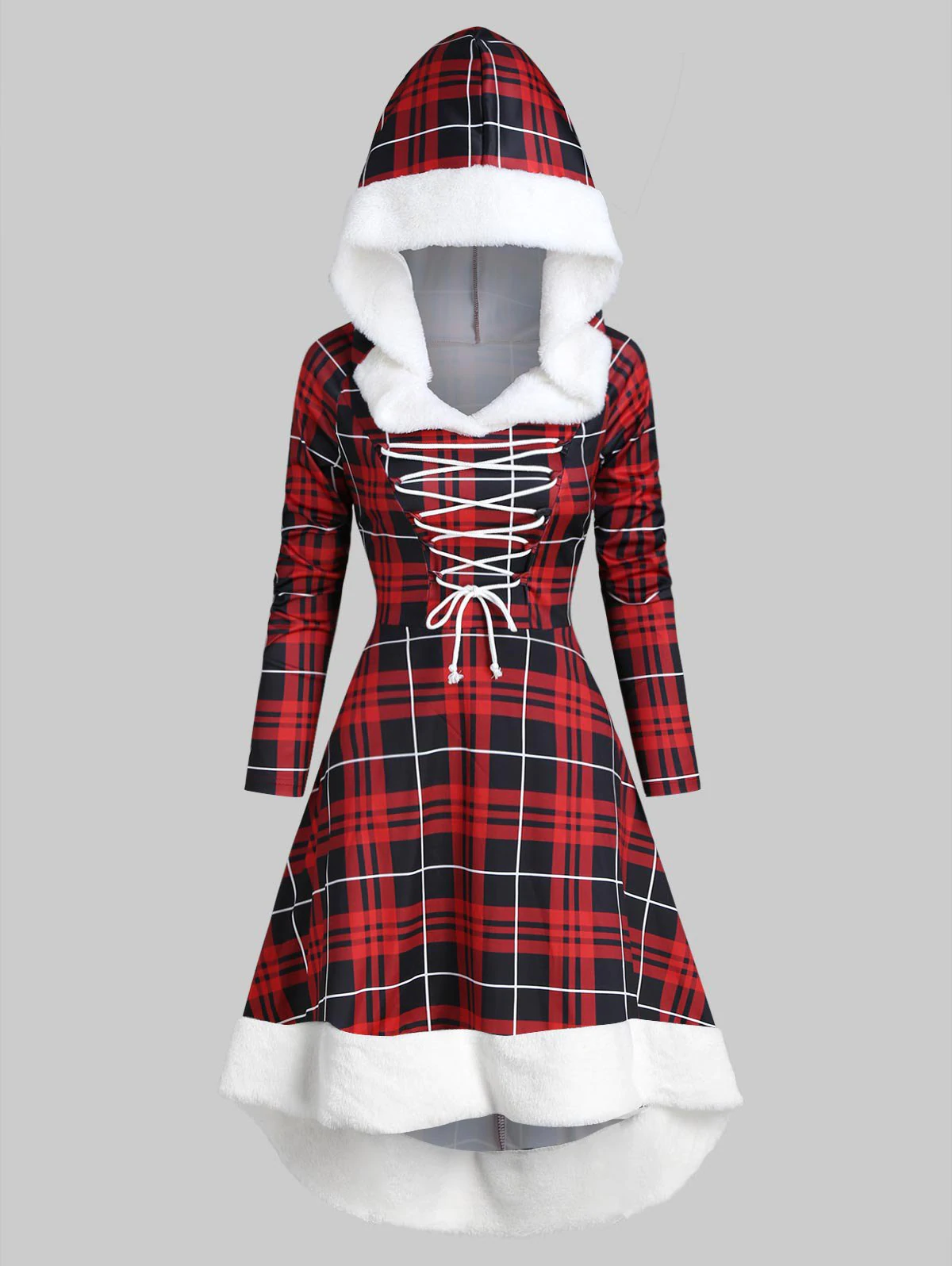 Plaid Faux Fur Insert Hooded Lace Up High Low Dress