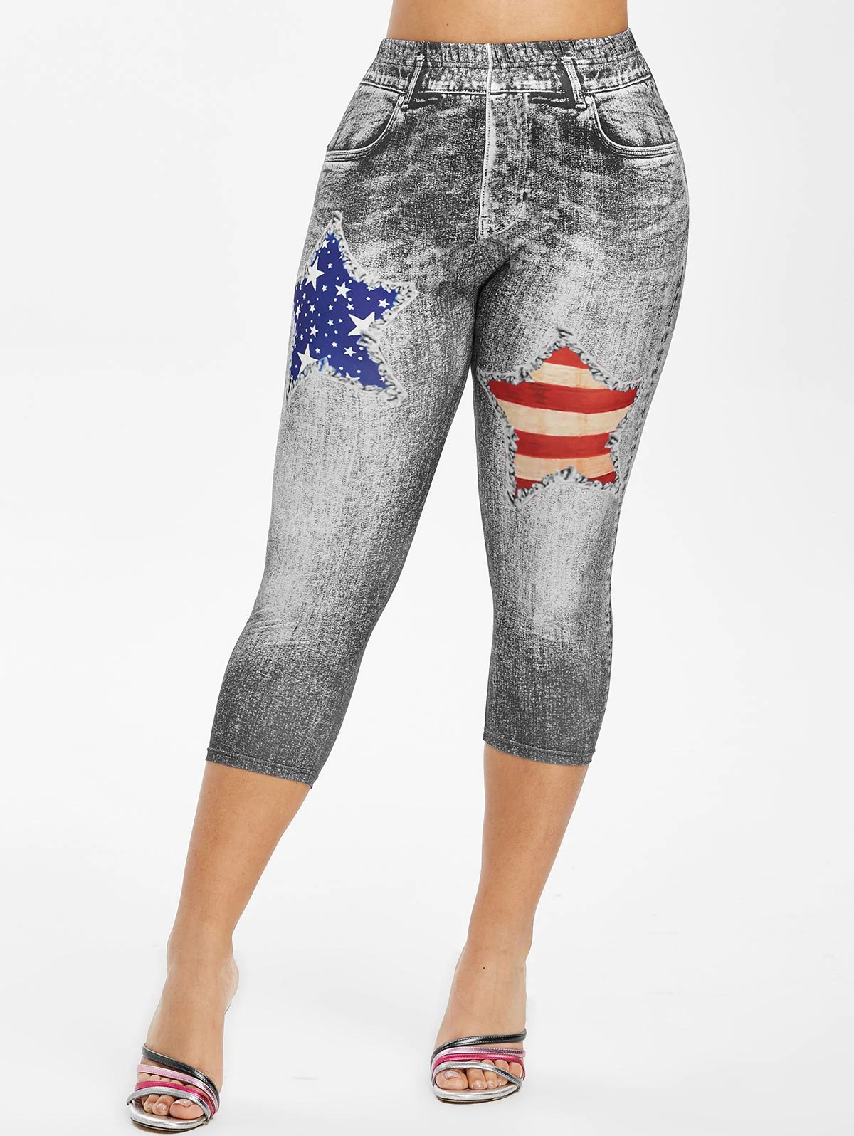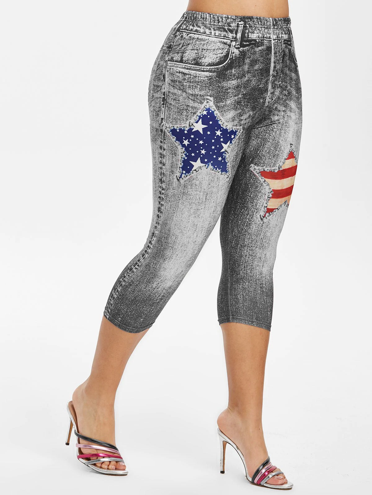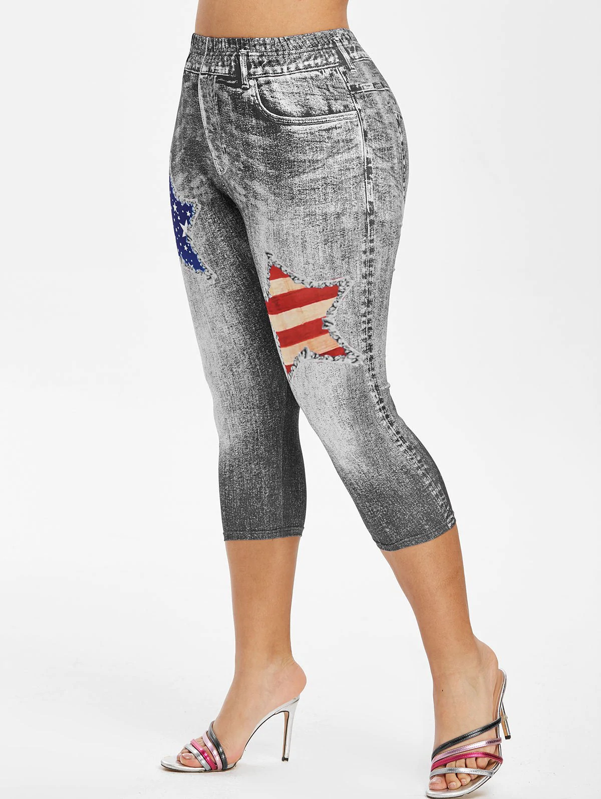 Plus Size American Flag 3D Destroyed Jean Print Cropped Jeggings