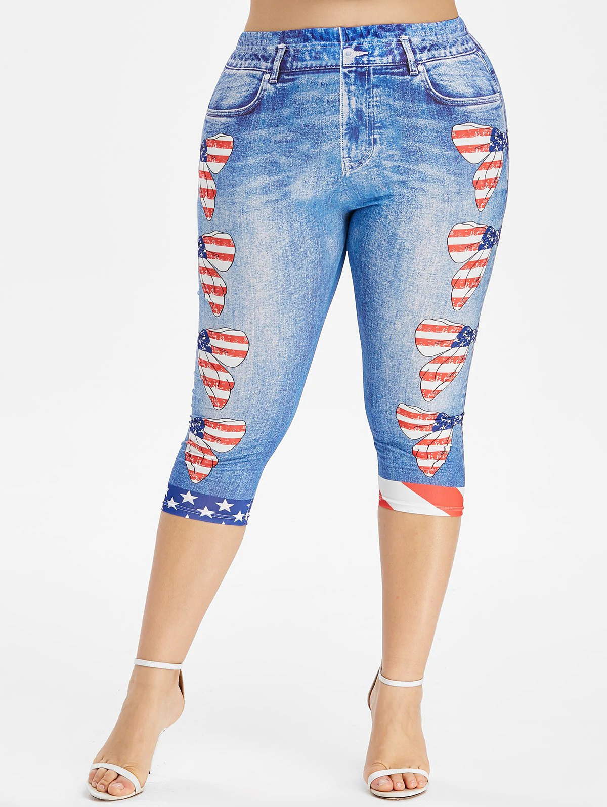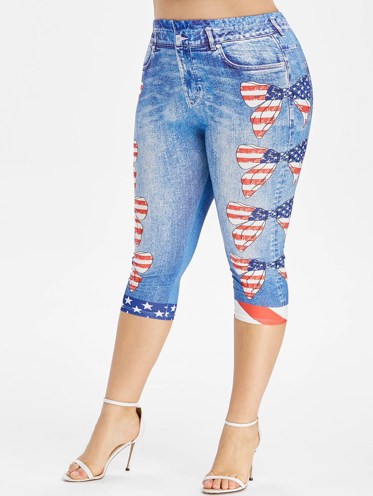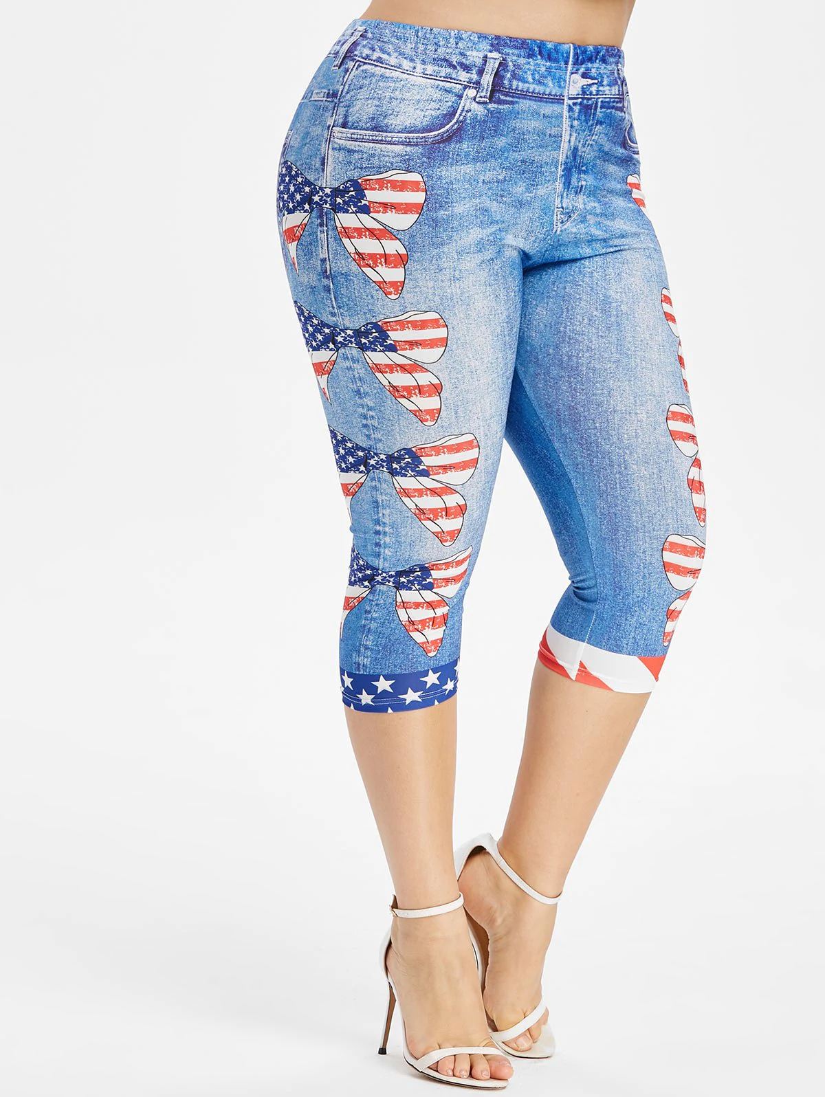 Get moving in these patriotic leggings featured in a stretch fit with capri length. These leggings combined 3D jean print with American flag bowknot pattern. High waist.