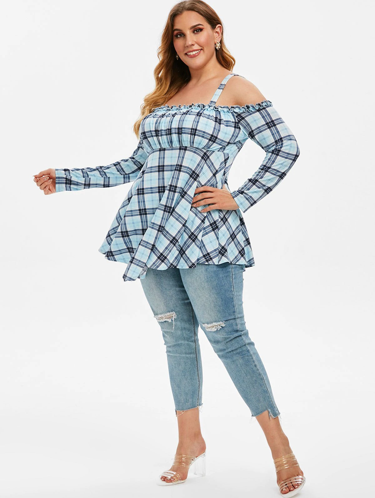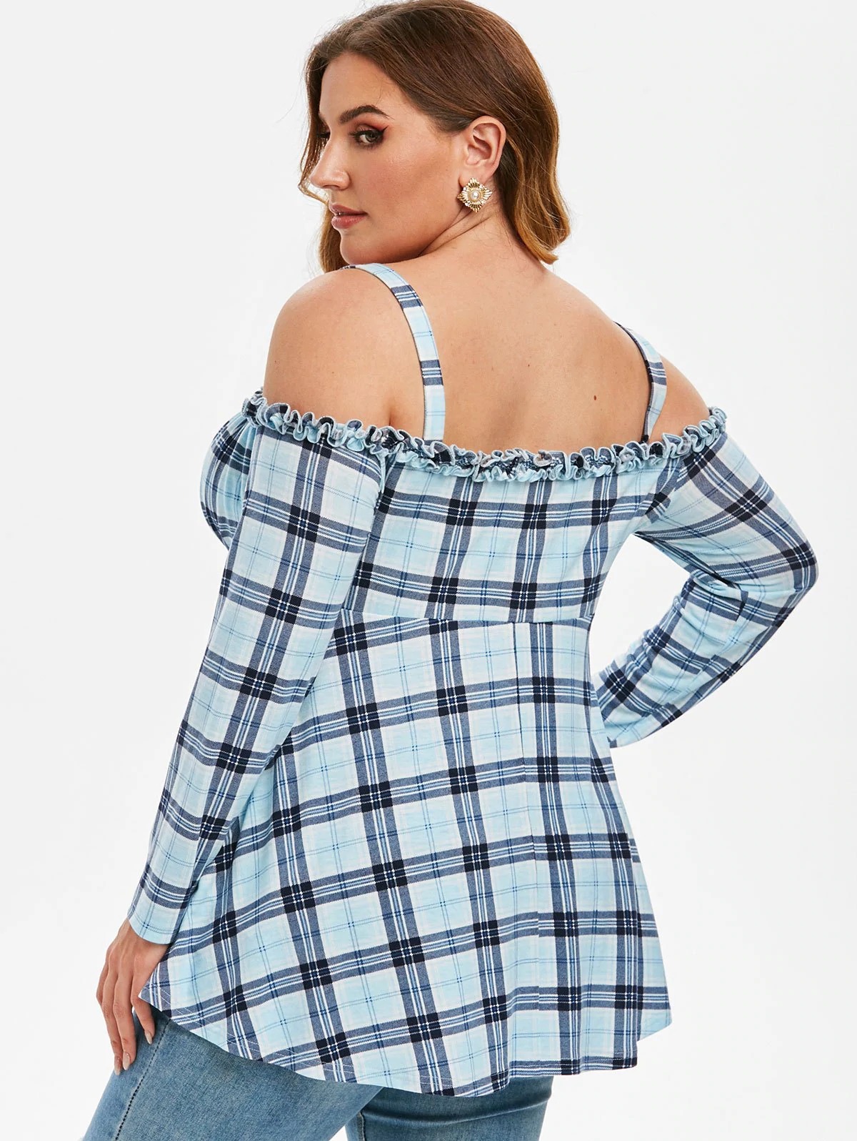 Plus Size Cold Shoulder Plaid Asymmetric Blouse