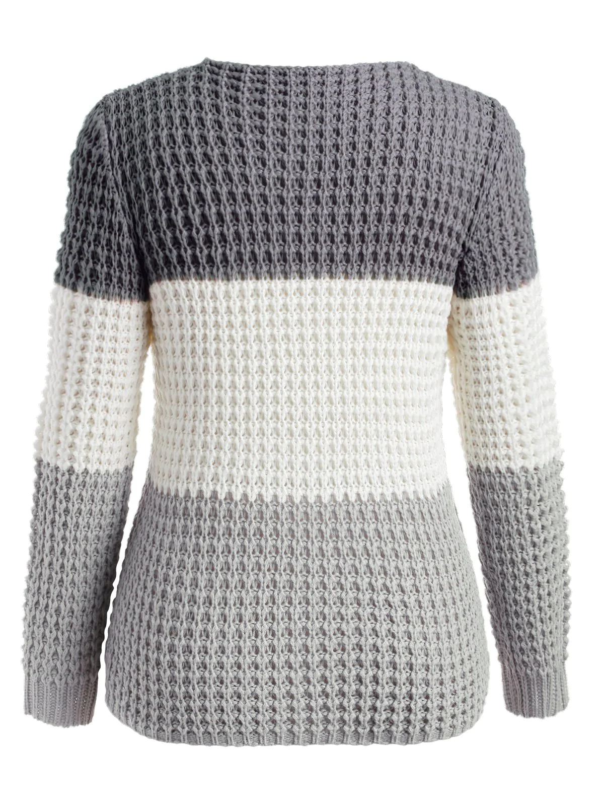 A slouchy, chunky sweater features a color-blocking design and a relaxed silhouette for a casual look and feel. Pair it with high waist jeans to complete this look!