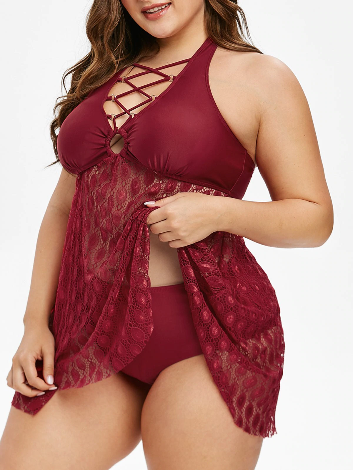 Plus Size Crisscross Lace Overlay Tankini Swimwear