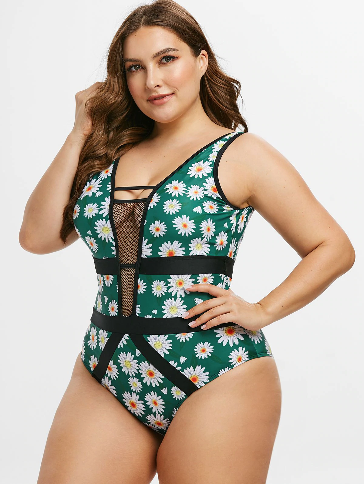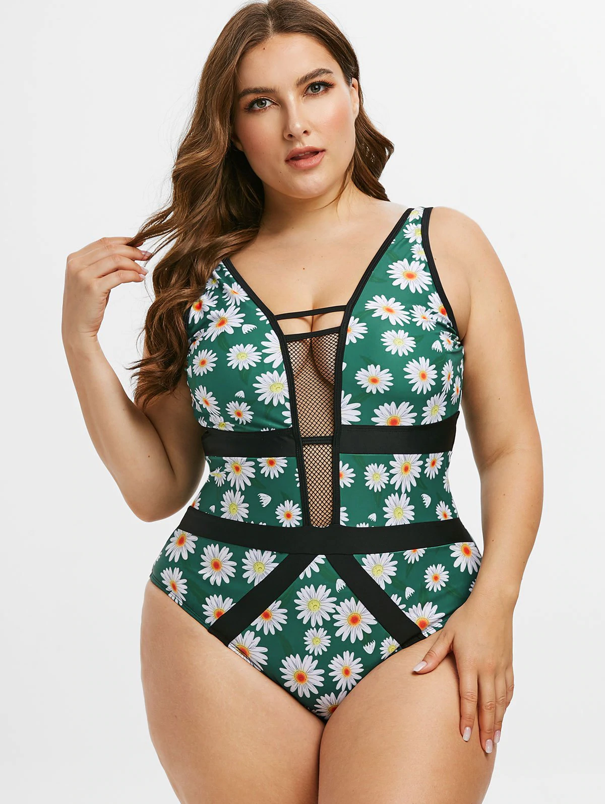 Plus Size Daisy Print Fishnet Insert One-piece Swimsuit