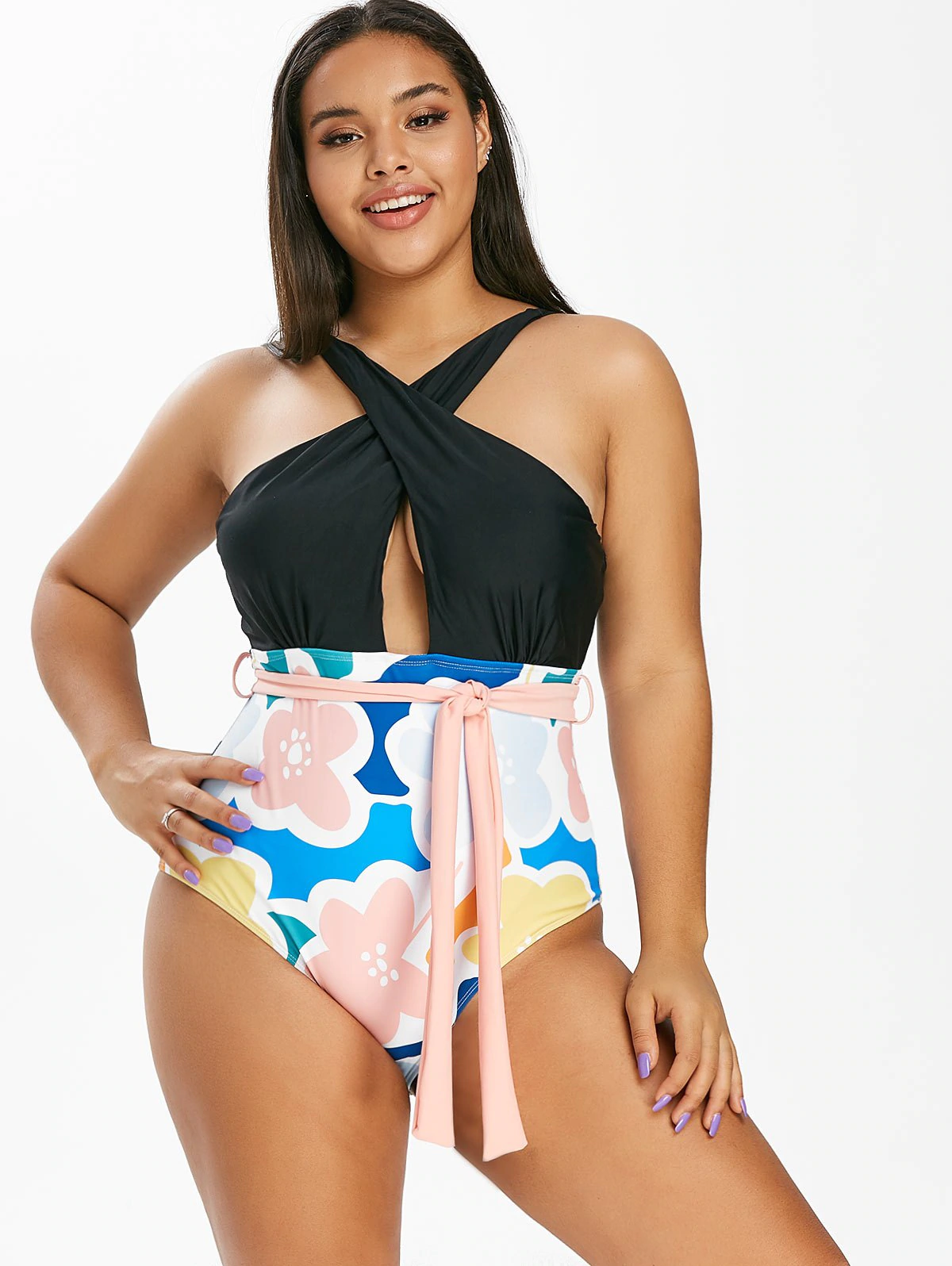 Plus Size Floral Print Crisscross Cutout One-piece Swimsuit