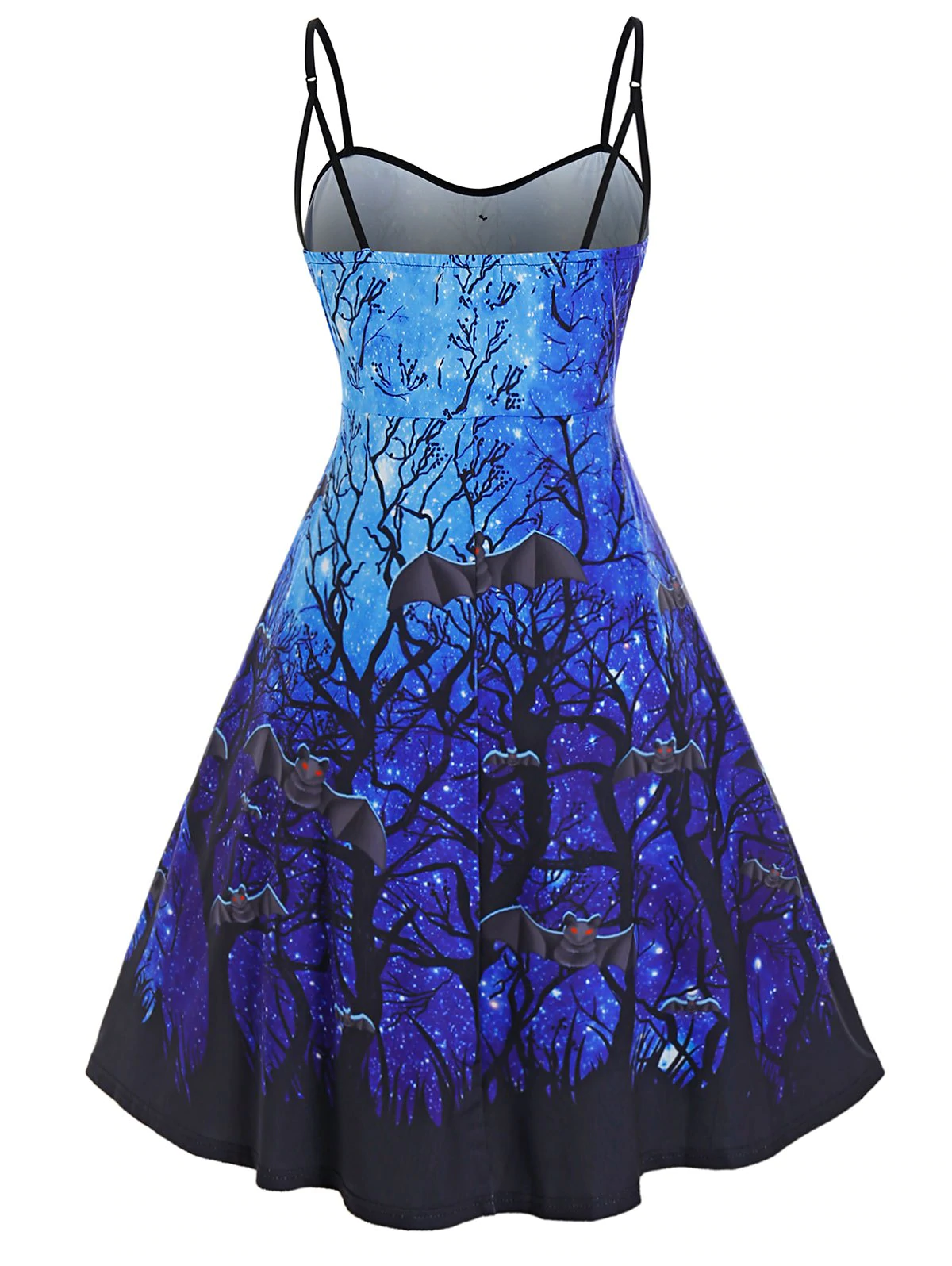 Plus Size Galaxy Night Halloween Bat Print A Line Dress