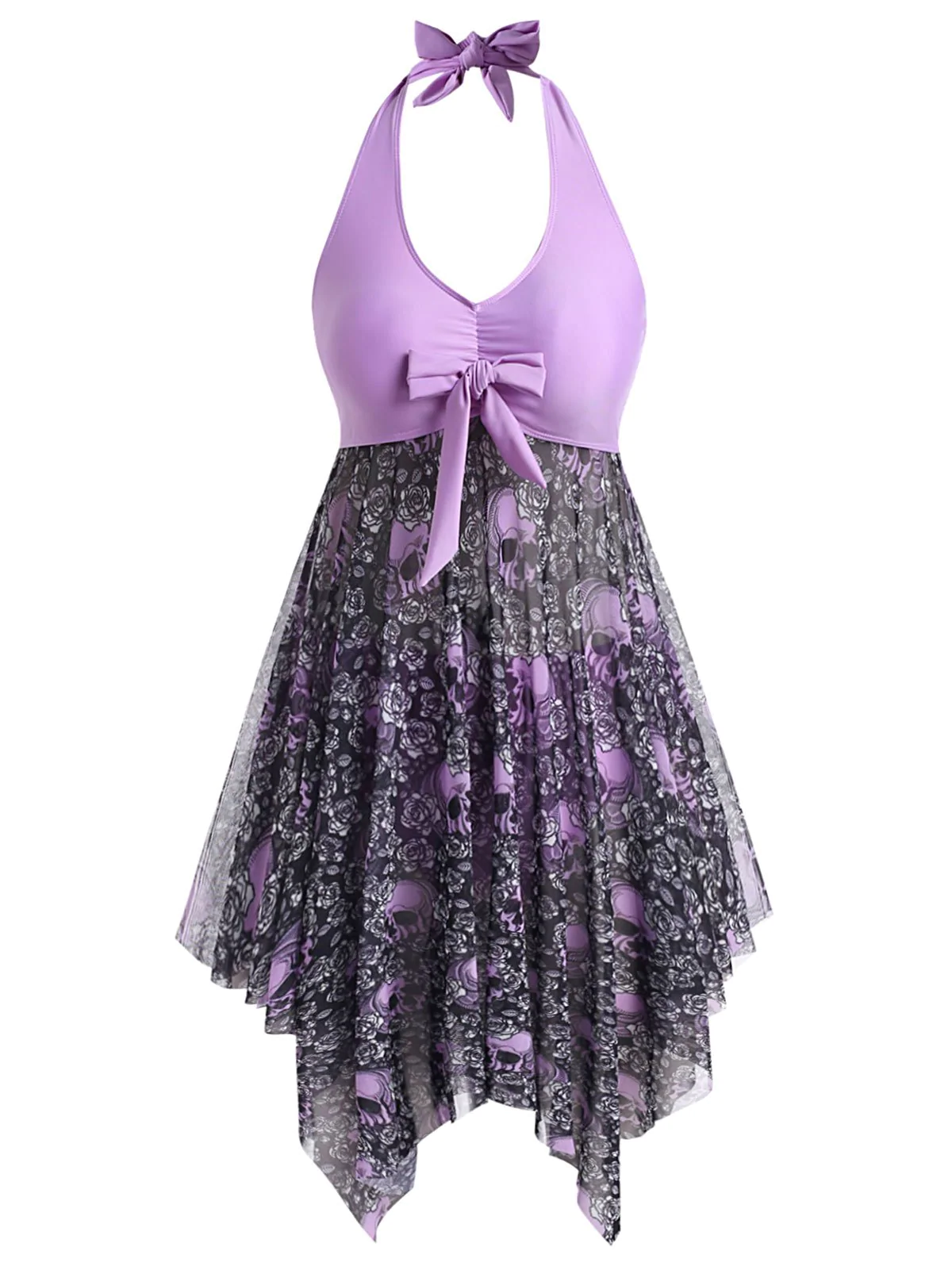 Plus Size Halloween Floral Skull Mesh Handkerchief Tankini Swimw