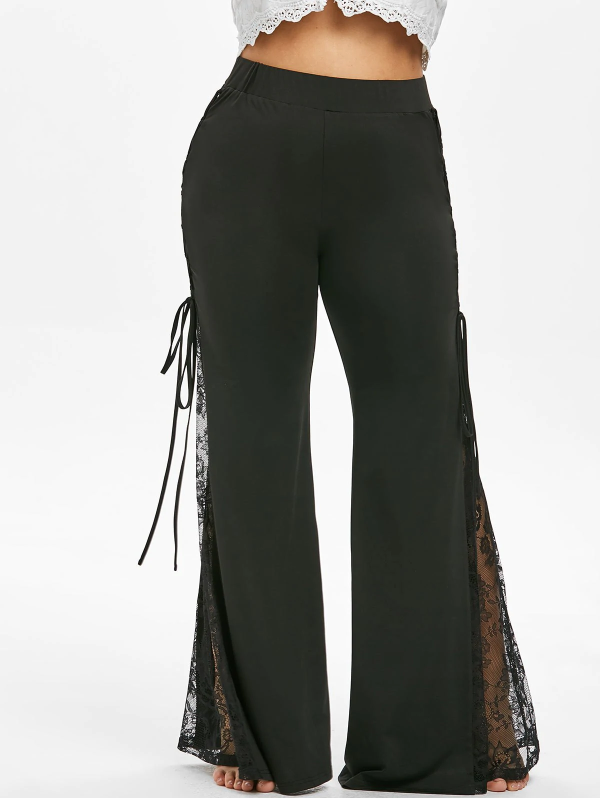 Look groovy and stay comfortable in these retro bell-bottom pants with a side lace-up detail, lovely lace insert, and a flattering high-rise silhouette. Wear them with any top for a stylish look.
