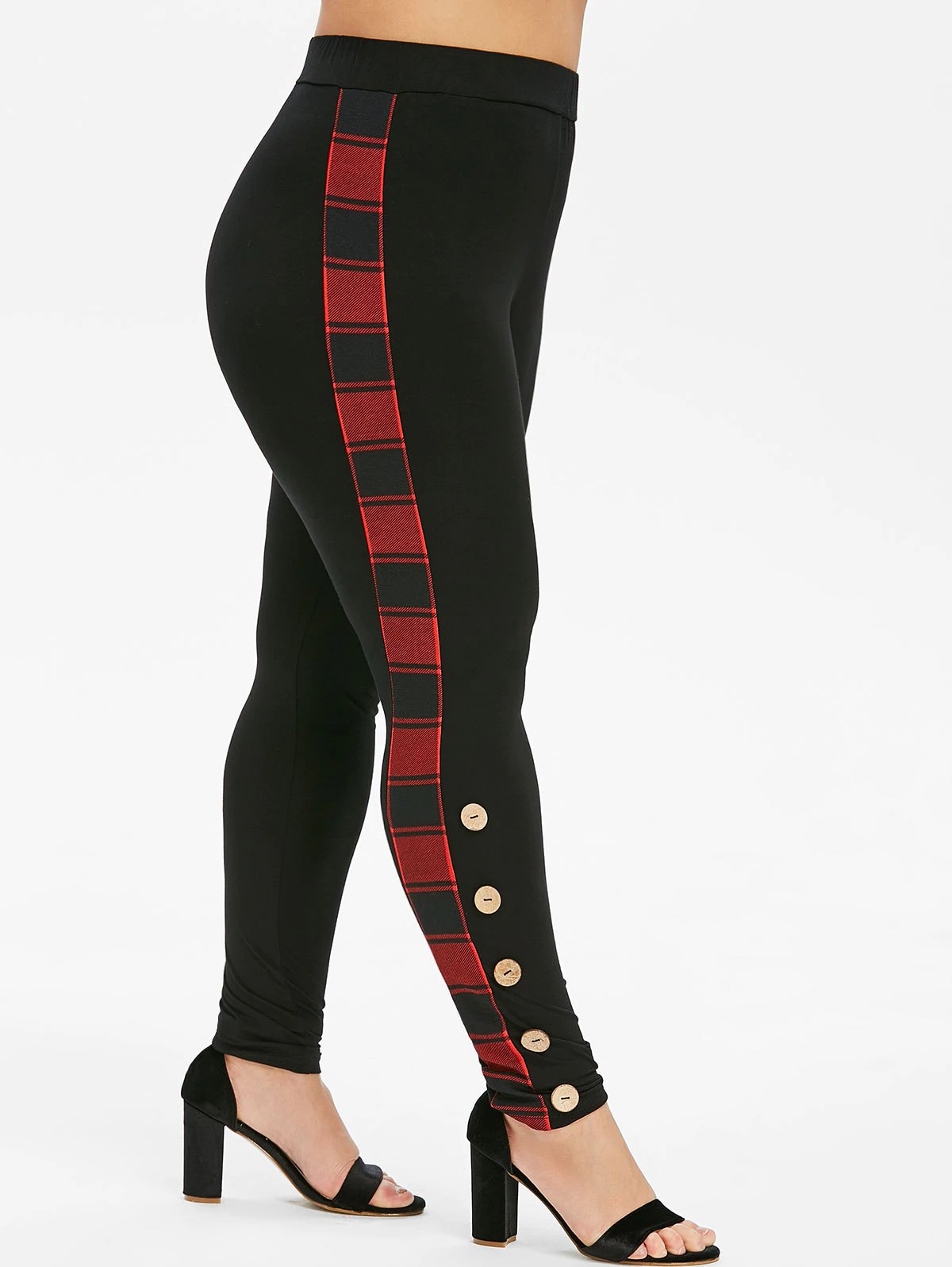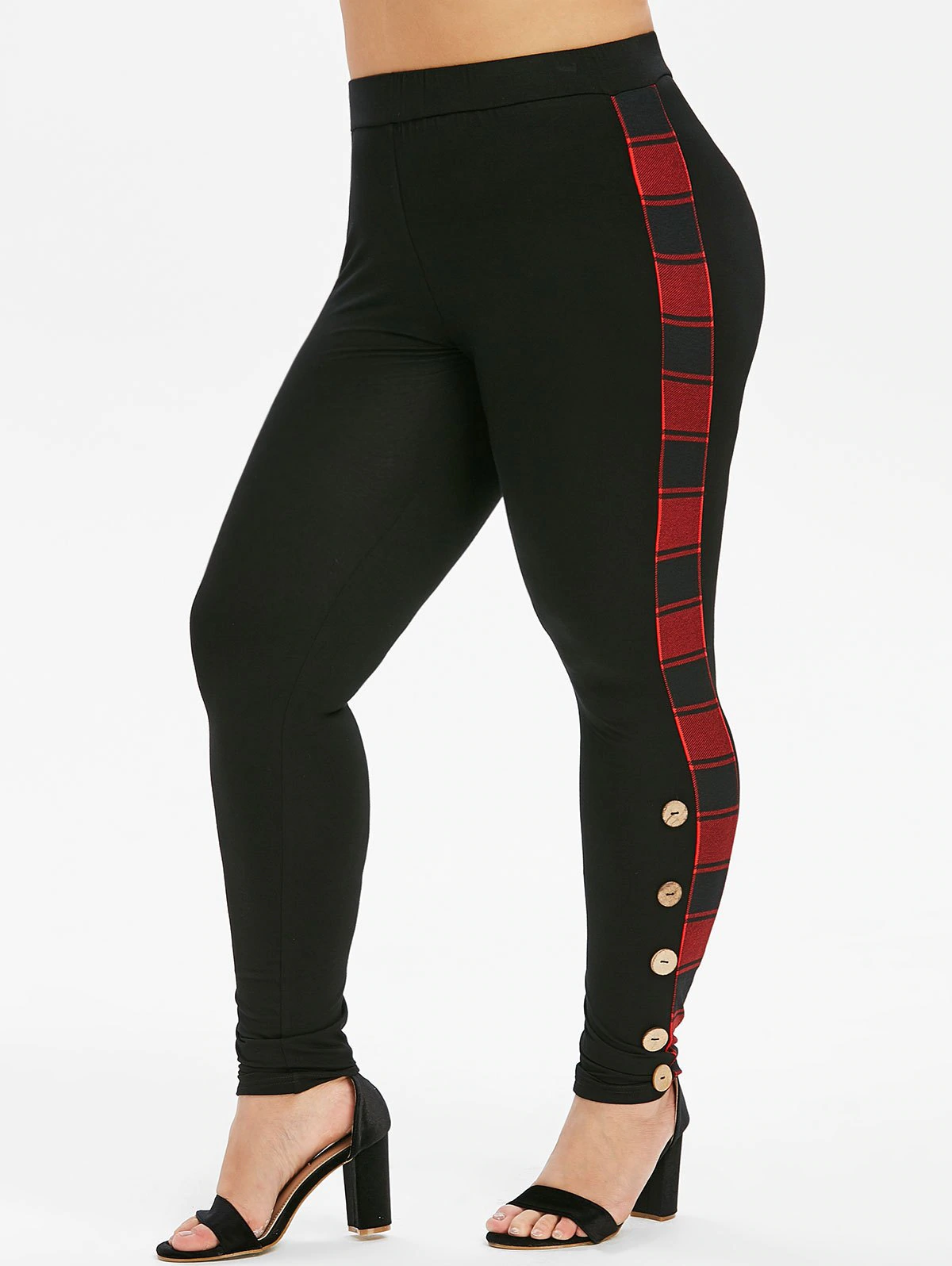Featuring contrast plaid at sides for decoration, the skinny pants feature a high waist and buttoned decoration for support and style.