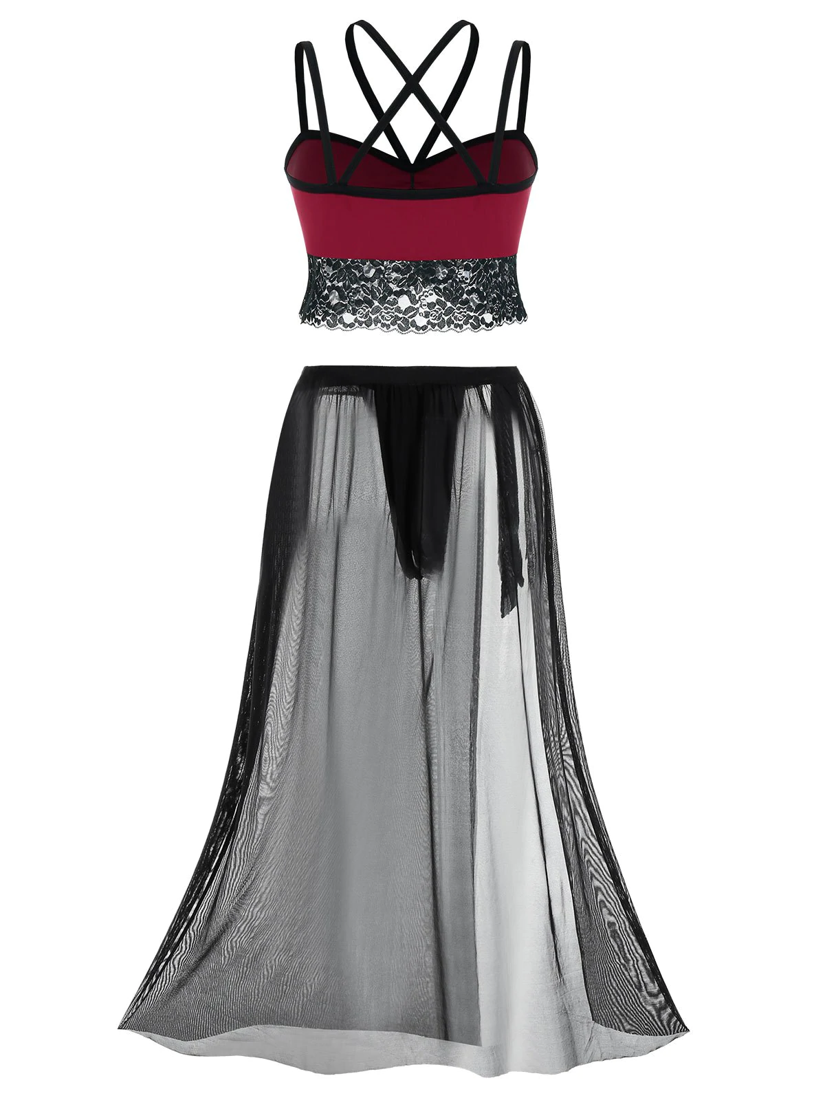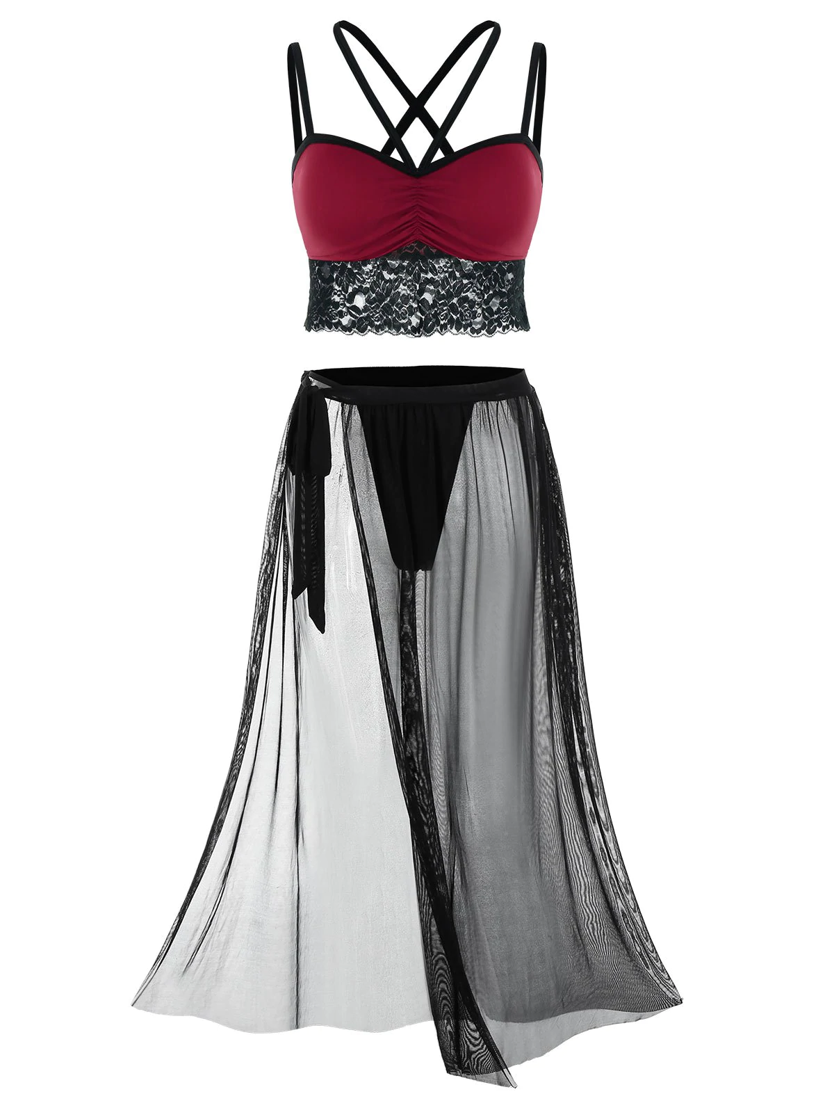 Plus Size Lace Panel Caged Top and Mesh Wrap Lingerie Skirt Set