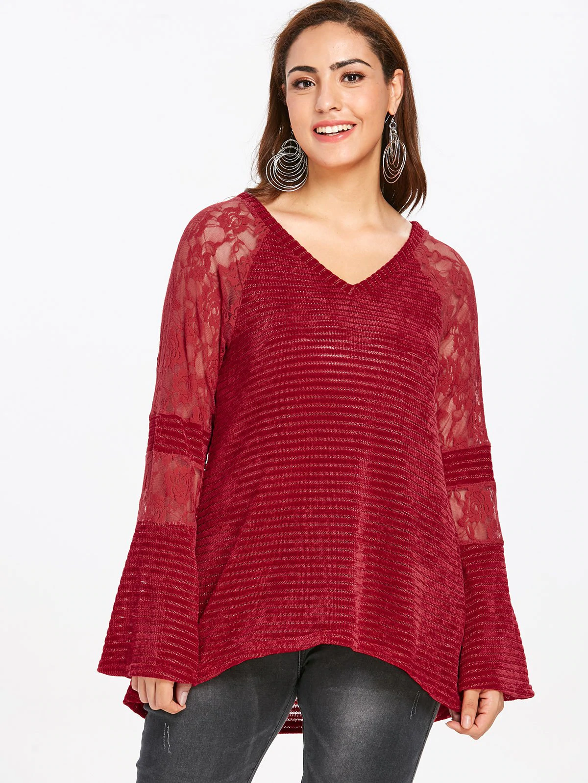 Plus Size Lace Panel Raglan Sleeve Knit Top