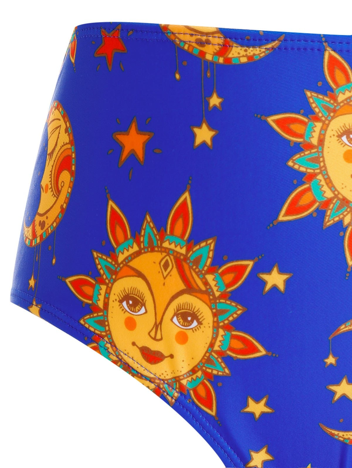 Designed with the on-trend mix and match style with the funny moon and sun pattern on the sleek bottom for added appeals, this tankini swimwear is fashioned with the crossover silhouette that shapes the figure with a self-tie knot to control the fit. An underwire bra provides added support while the unremovable pads help you enjoy the easy wearing experience.