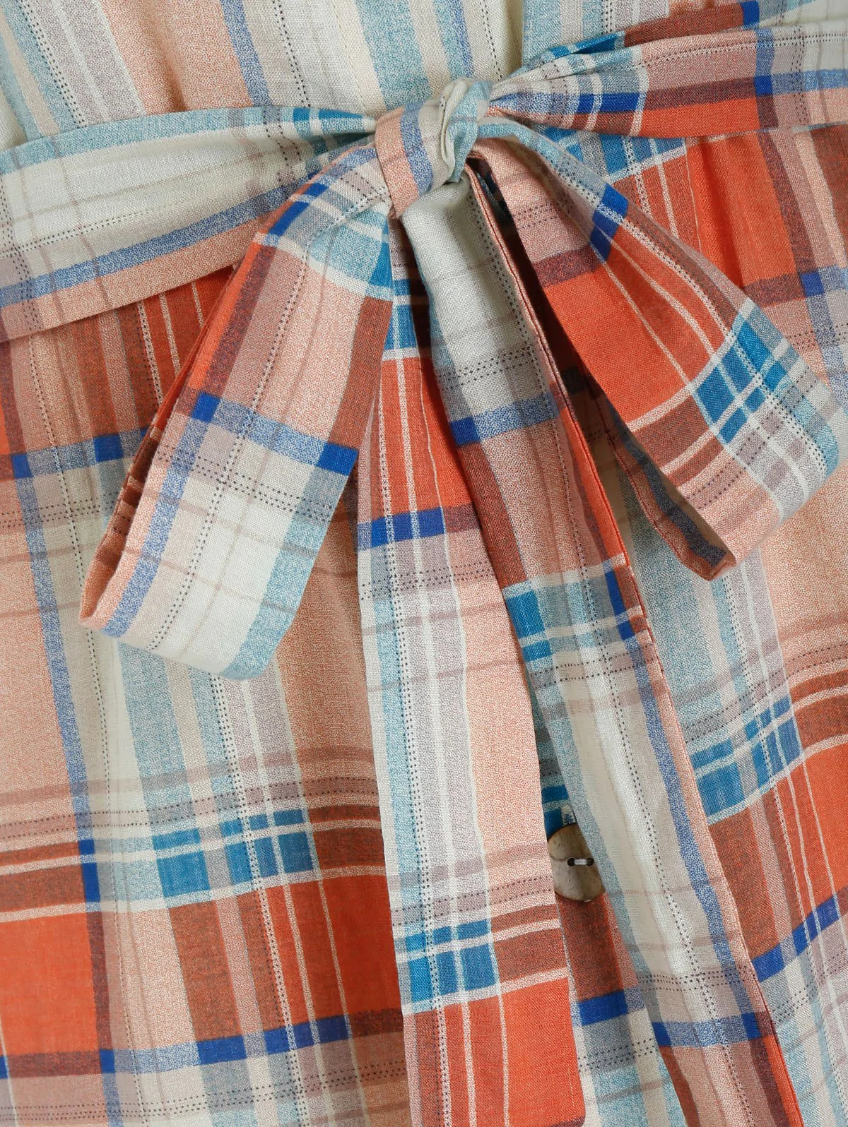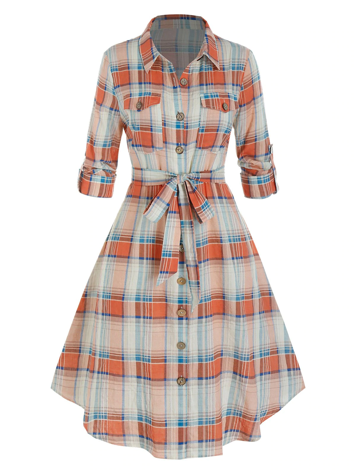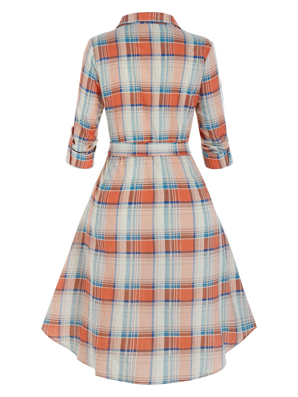 Plus Size Plaid Rolled Up Sleeve Belted Shirt Dress