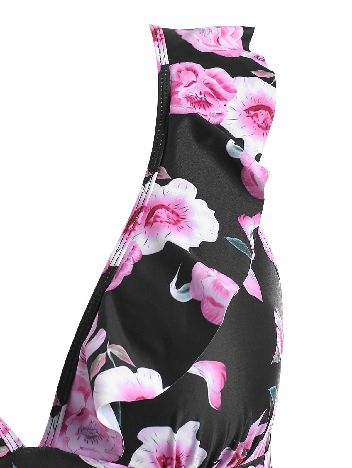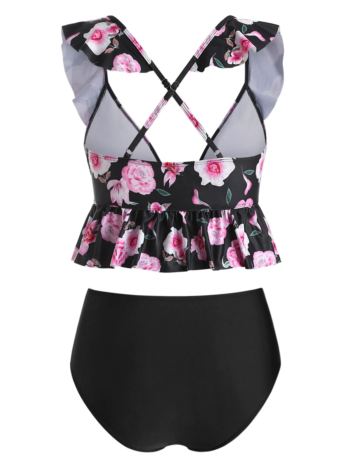 Plus Size Plunge Floral Print Ruffled Tankini Swimwear