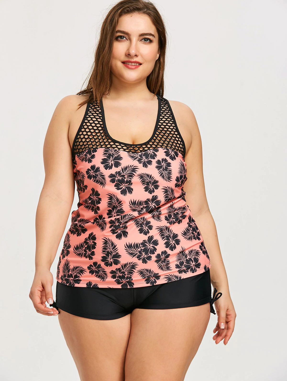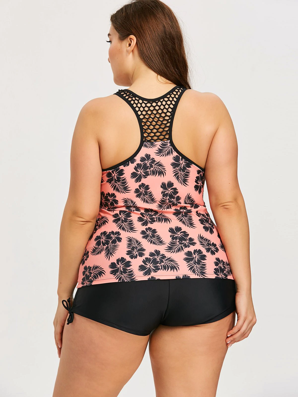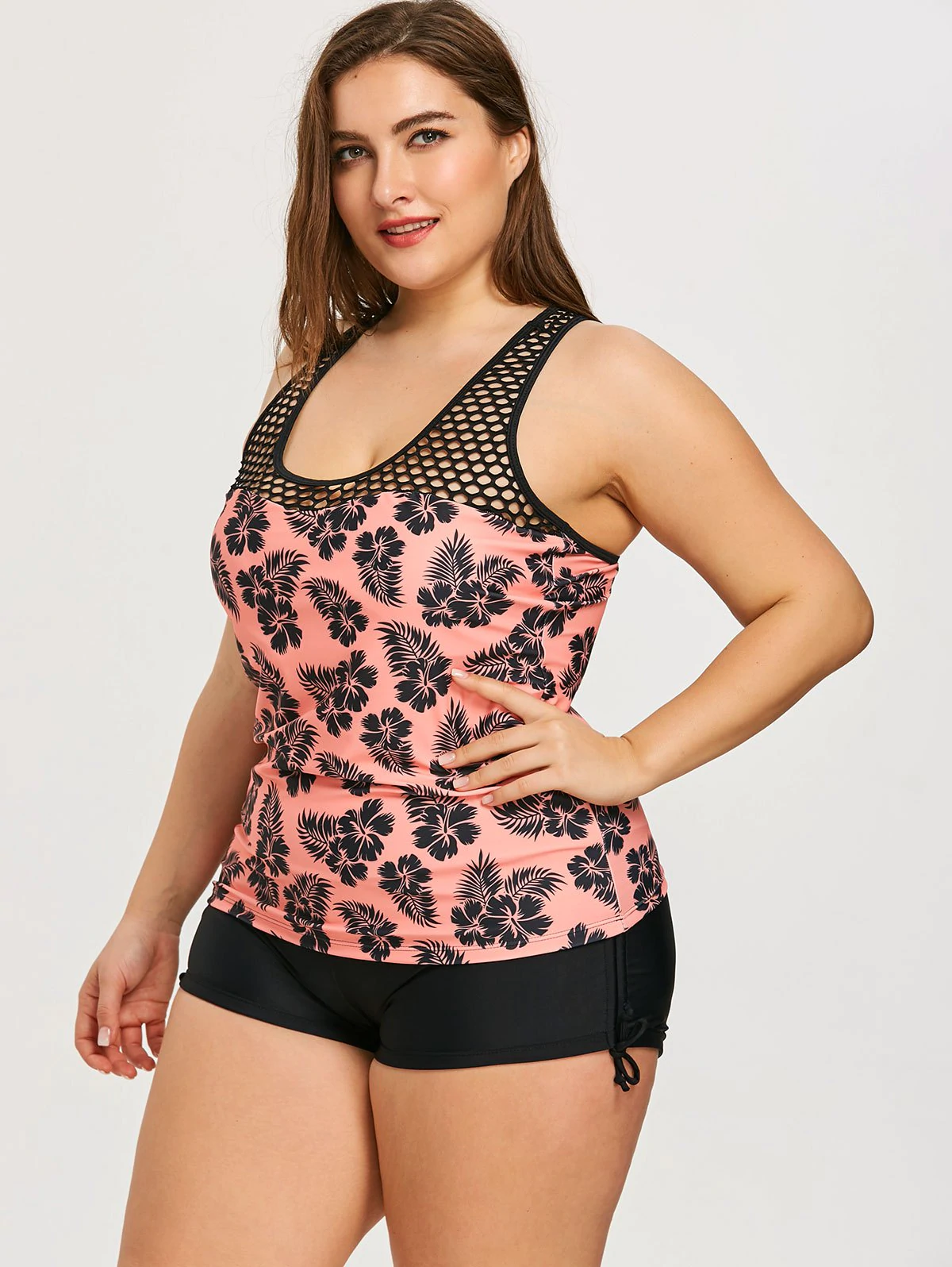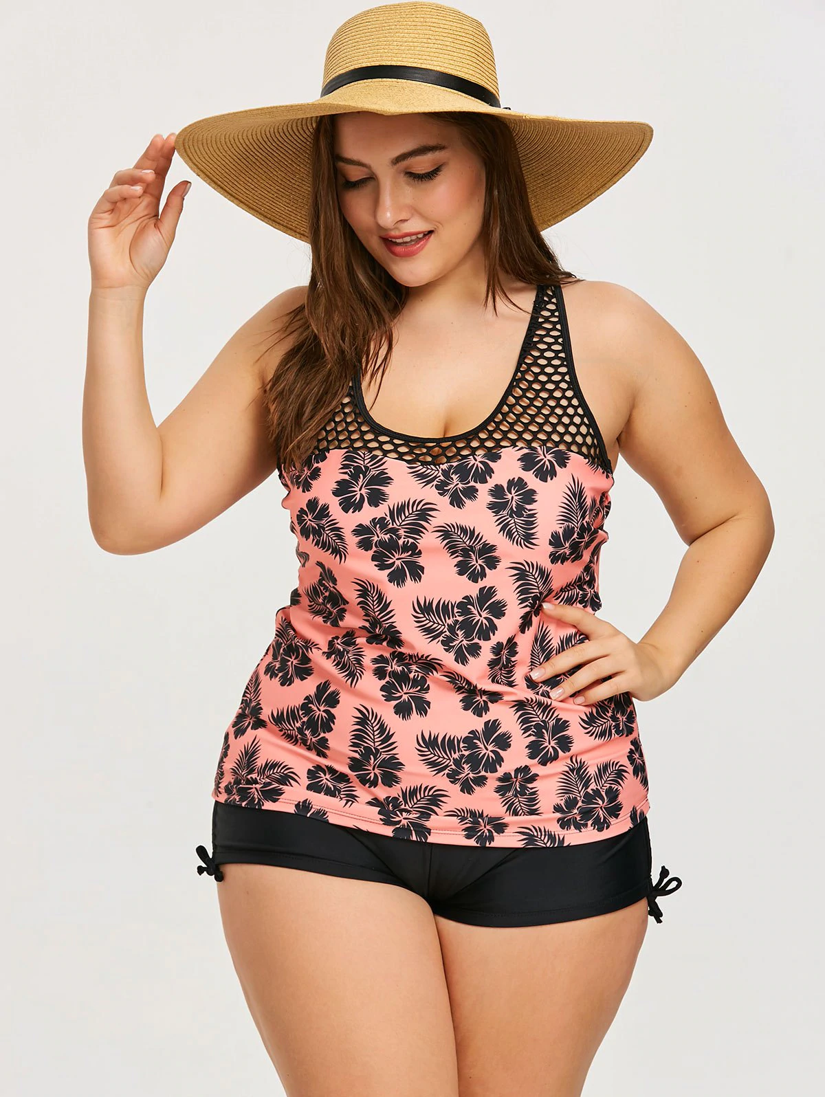 Make your beach holiday with fun and happiness, you need this kind of tankini set. The floral tank top features sexy U neckline, openwork details and fashion racerback design. The solid boyshort swim bottom has drawstring knot sides. It's suitable for beach, pool, and other water activities.