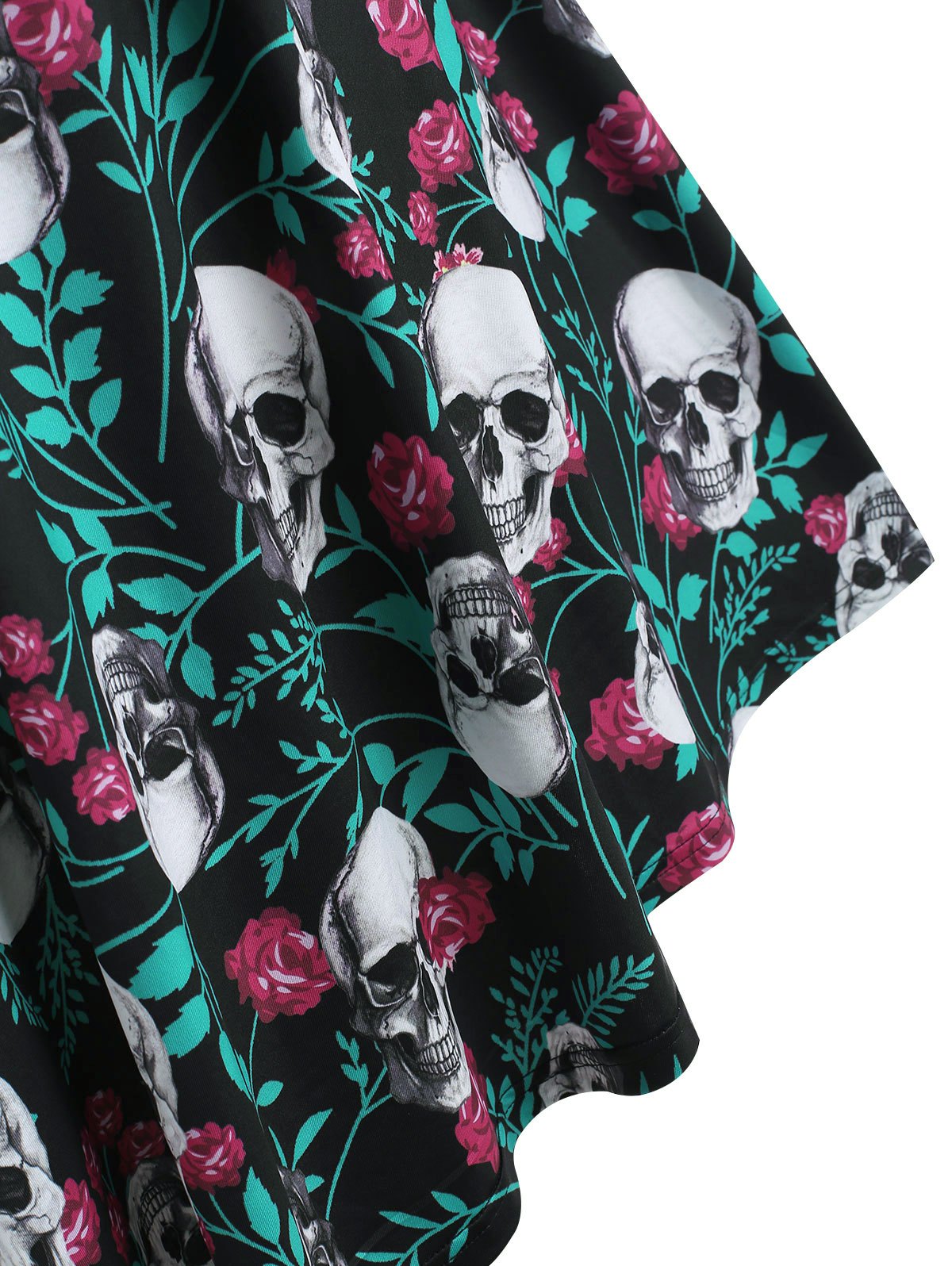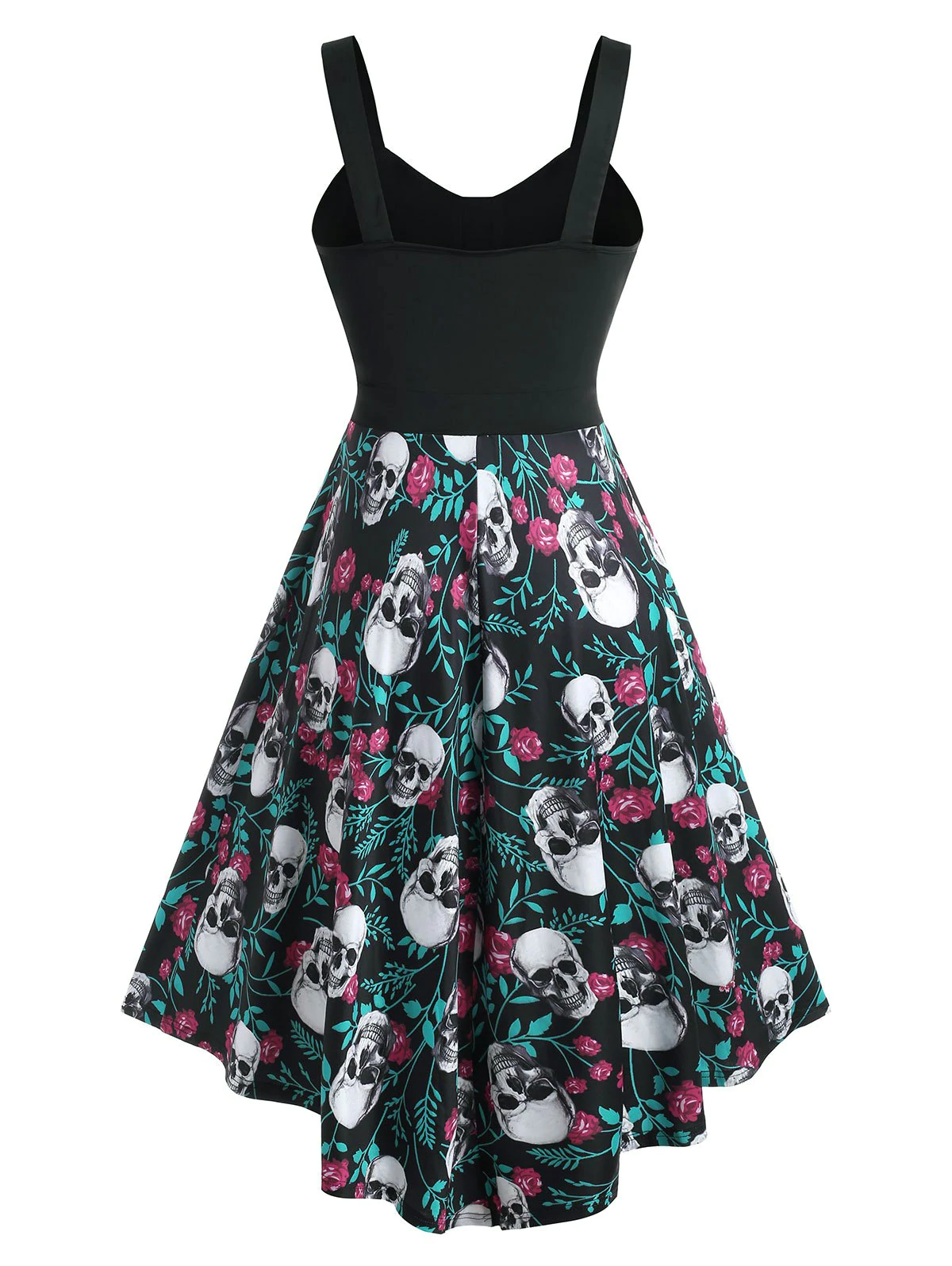 Plus Size Skull Rose Print Halloween Fit and Flare Dress