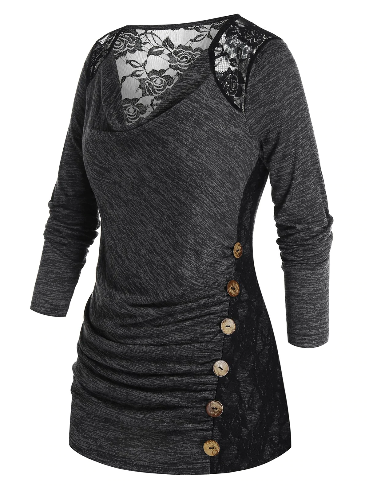 Embellishment: Button,Lace,Ruched,See Thru