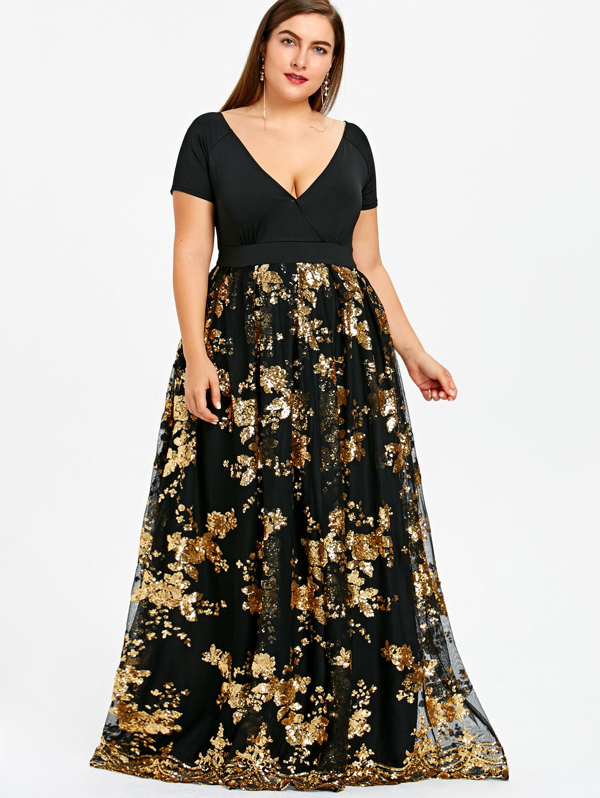 Plus Size Sparkly Sequined Floral Maxi Formal Dress