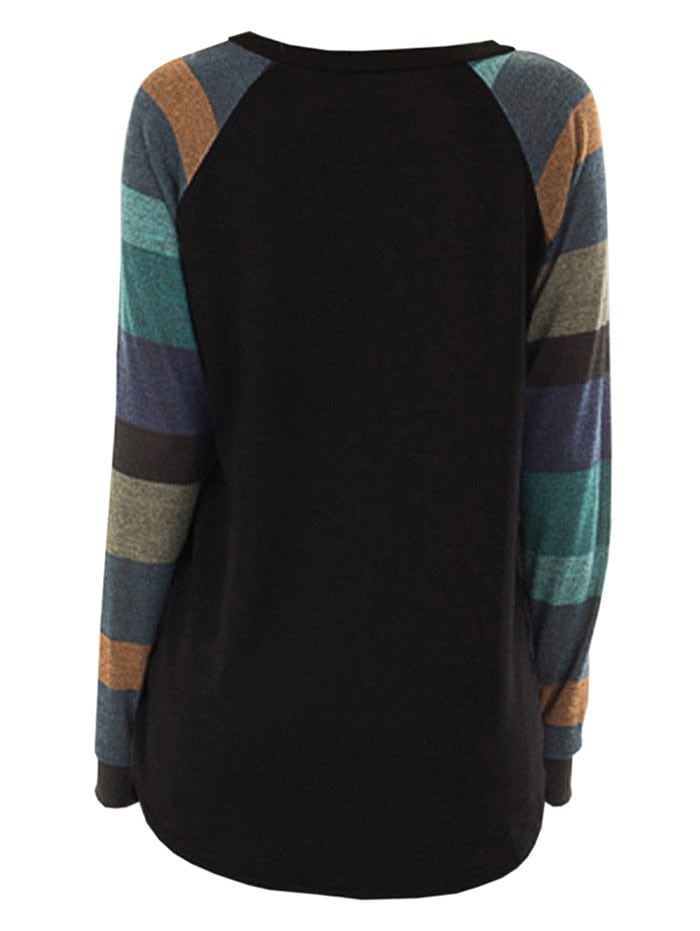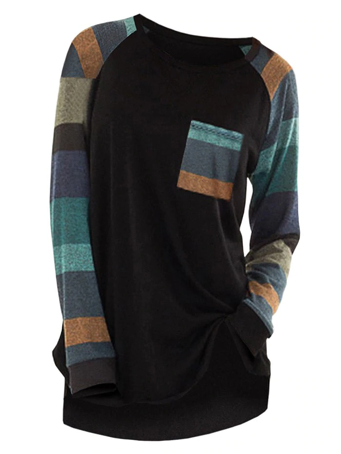 A casual long-sleeved t-shirt is elevated with color-blocking stripe print and a front pocket.