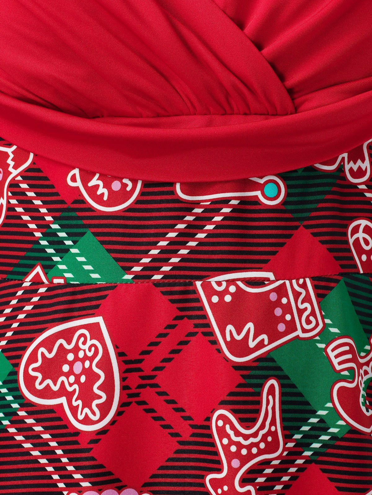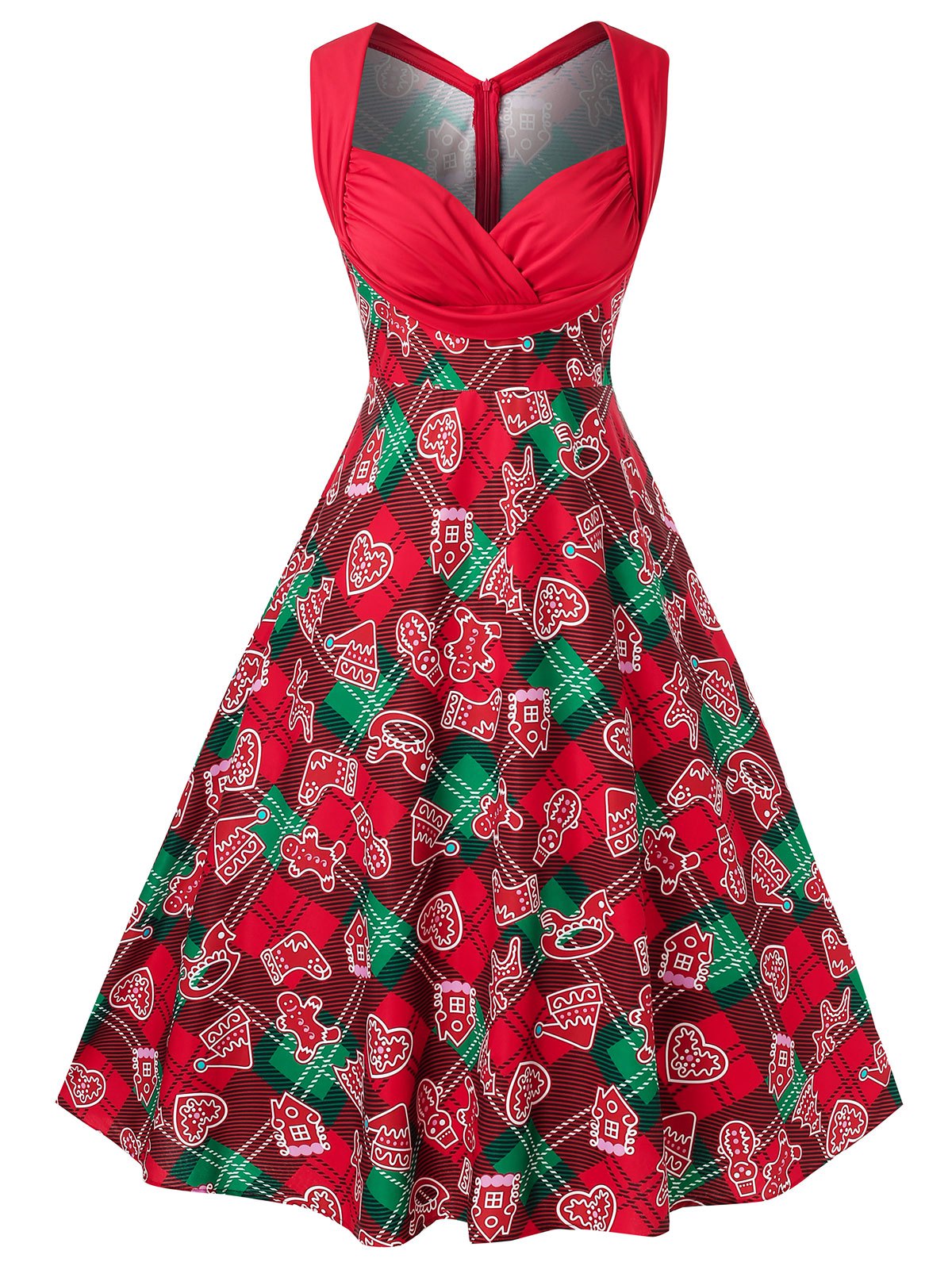 Get in the Christmas spirit with this vintage -style dress featuring a playful allover holiday-themed print, alluring sweetheart neck, and a high waist design for an easy fit.