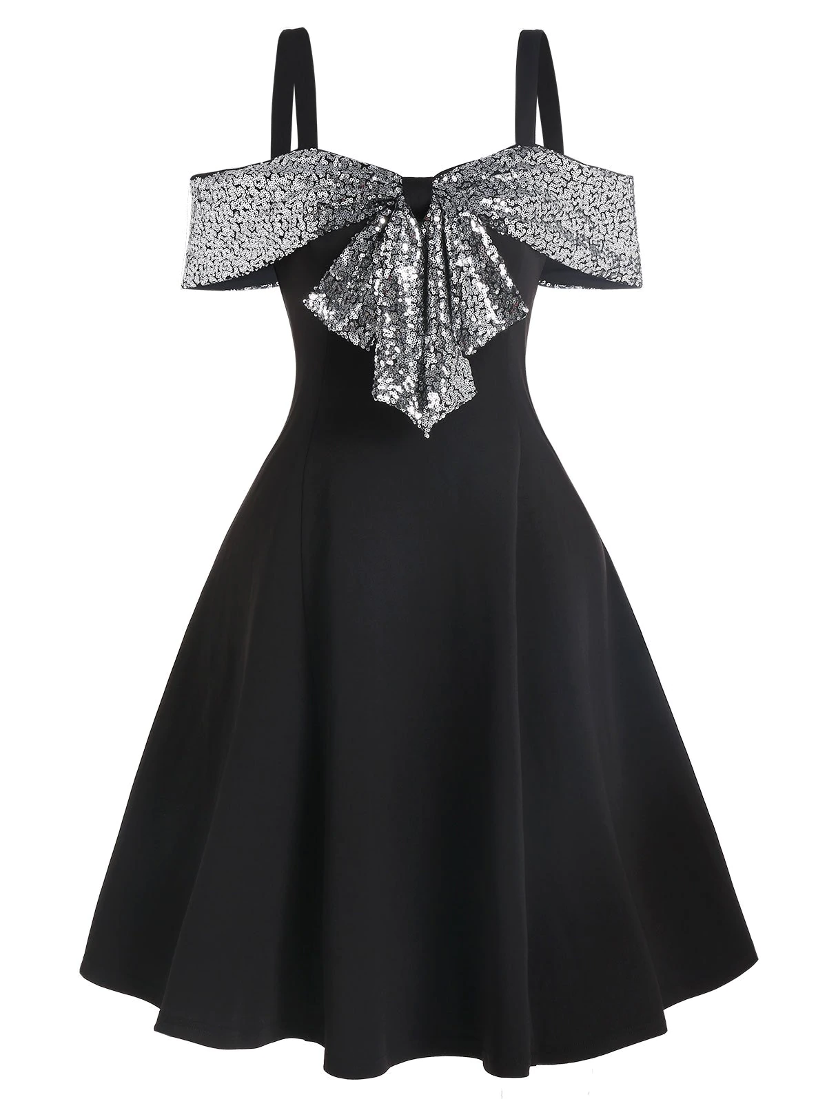 3 reviews for Sequin Panel Open Shoulder Skater Dress