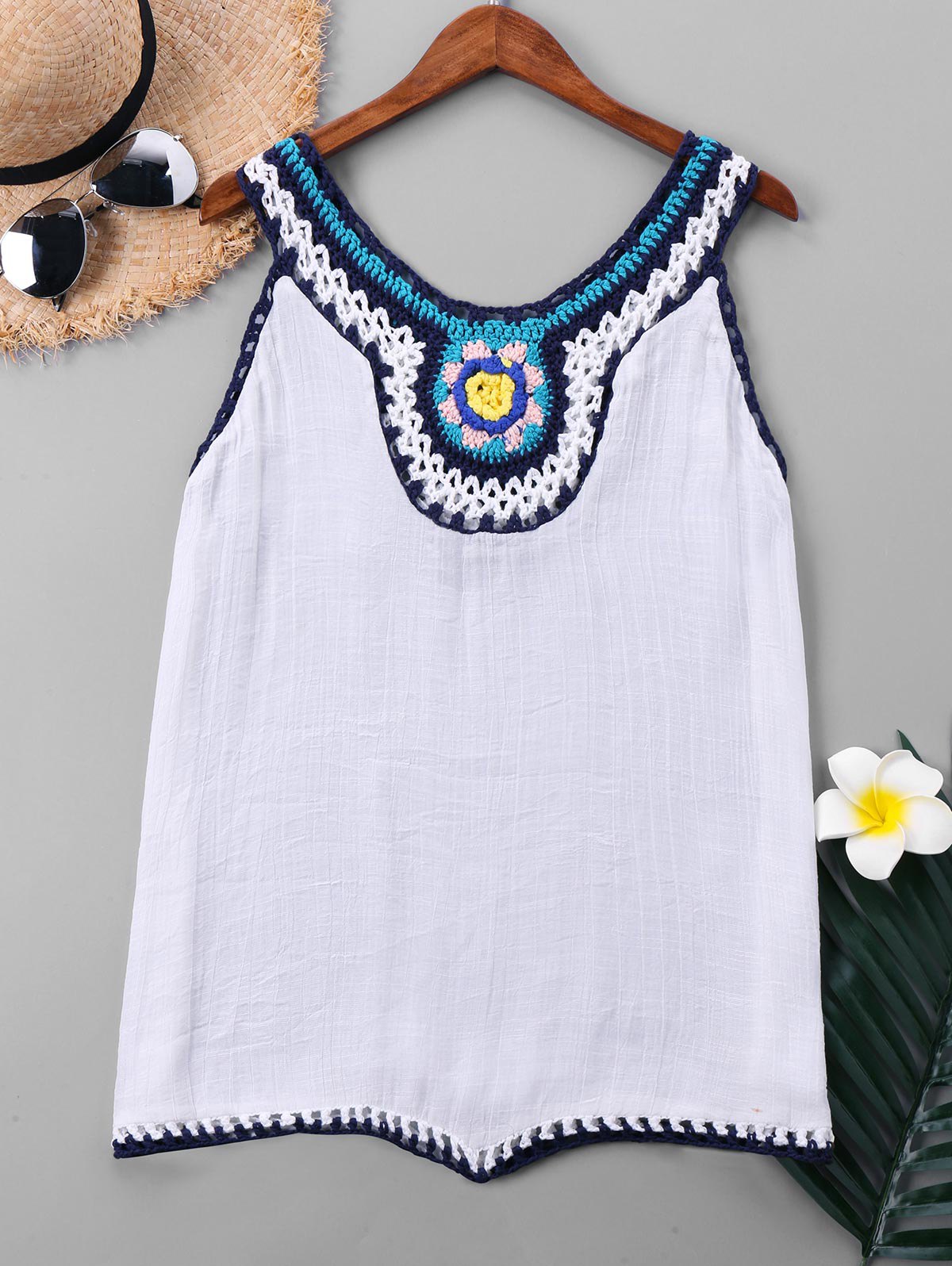 Get a fun look in this women's cover up! Features a scoop neckline with crochet trim detailing and sleeveless slouchy silhouette. The playful piece may have you dream about moving to a little place by the beach, then you could wear this every day!