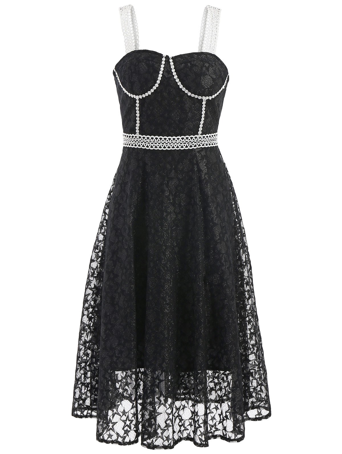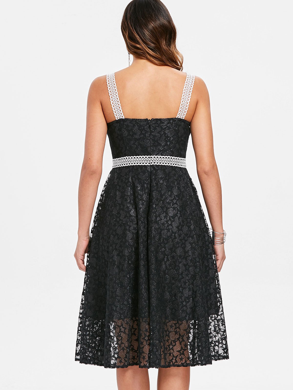 Look amazing in this color block lace dress. Sleeveless and stunning star lace overlay dress with contrast crochet at the wide shoulder straps, waist and around the bust for an eye-catching appeal. The length hits under the knee. Rear concealed zipper closure.