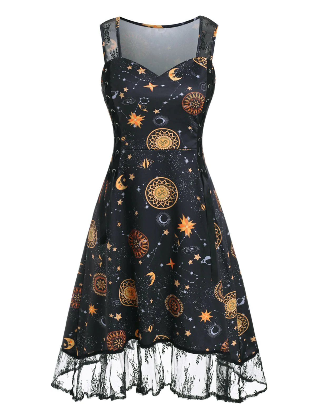 Sun Moon Star Print Lace Insert Lace-up Dress