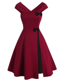 Style: Elegant Occasion: Cocktail & Party,Prom Material: Polyester Silhouette: A-Line Dresses Length: Mid-Calf Neckline: V-Neck Sleeve Length: Short Sleeves Embellishment: Bowknot Pattern Type: Colorblock Fabric Stretch: Slight Stretch With Belt: No Season: Fall,Spring Weight: 0.4500kg Package Contents: 1 x Dress