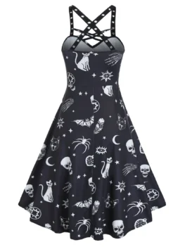 Style: Gothic Occasion: Day Material: Polyester,Spandex Silhouette: High Low Dresses Length: Knee-Length Neckline: Straps Sleeve Length: Sleeveless Waist: High Waisted Embellishment: Lace up Pattern Type: Animal,Moon,Skeleton,Skull,Star With Belt: No Season: Fall,Spring,Summer Weight: 0.2900kg Package Contents: 1 x Dress
