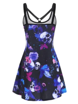 • Skull Butterfly Print O Ring Strappy Tank Dress