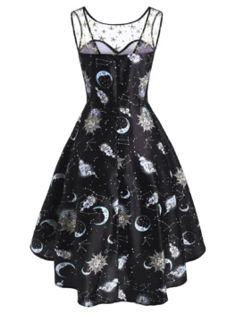 Sparkle Star Moon Sun Print Lace Insert High Low Dress
