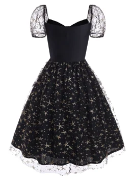 Sparkly stars scatter through the lace overlay and lace sleeves to make you outstanding in the crowd. The large bowknot is placed around the neckline to highlight your beautiful collarbones and draw the eye upward to your face.    Style: Fashion Occasion: Cocktail & Party,Day Material: Polyester Silhouette: A-Line Dresses Length: Knee-Length Neckline: Sweetheart Neck Sleeve Type: Puff Sleeve Sleeve Length: Short Sleeves…