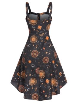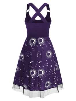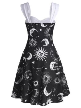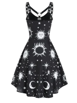 Try this sun, moon and star print dress which features an alluring backless design, while the crisscross straps make it more inviting. The lace overlay adds an elegant feeling. And the large O rings separate it apart from others in a wonderful way.   Style: Gothic Occasion: Casual  Material: Polyester Silhouette: A-Line Dresses Length: Mid-Calf Neckline: Scoop Neck Sleeve Length: Sleeveless Embellishment: Criss-Cross,Lace…