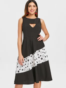 Tailored with clean, figure-smoothing lines, this vintage-inspired dress also has a triangle cutout in the middle of the chest and the stars patchwork twirled flared skirt. Hidden back-zip closure.   Style: Vintage Material: Polyester Silhouette: A-Line Dress Type: Fit and Flare Dress Dresses Length: Knee-Length Neckline: Round Collar Sleeve Length: Sleeveless Embellishment: Cut Out Pattern Type: Print,Star With Belt: No Season: Fall,Spring,Summer Weight: 0.3000kg Package Contents: 1 x…