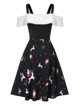 Style: Fashion Occasion: Christmas,Cocktail & Party Material: Polyester Silhouette: Asymmetrical Dresses Length: Knee-Length Neckline: Spaghetti Strap Sleeve Length: Sleeveless Embellishment: Lace up Pattern Type: Santa Claus With Belt: No Season: Fall,Winter Weight: 0.3300kg Package Contents: 1 x Dress